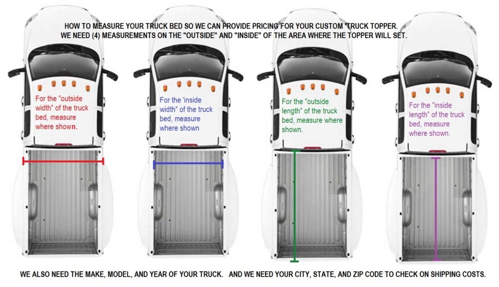 For Complete pricing, you must provide the (4) measurements from the chart below. the Make/Model/Year of your truck, along with your CITY, STATE, AND ZIP CODE so we can also provide the shipping cost.