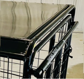 You can get a cover for the Metal Top GOAT TOTES to protect animals during bad weather. With a cover, the back, sides, and top are enclosed with the cover. When a cover is used, we add a bar to the front top section of the solid roof (pictured), so the cover can be attached in this area. No extra charge for this addition if a cover is ordered as the same time as the tote. Goat Tote Covers and prices are listed at the top of this page in the Standard Goat Tote section. The same covers are used on the metal top totes.